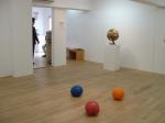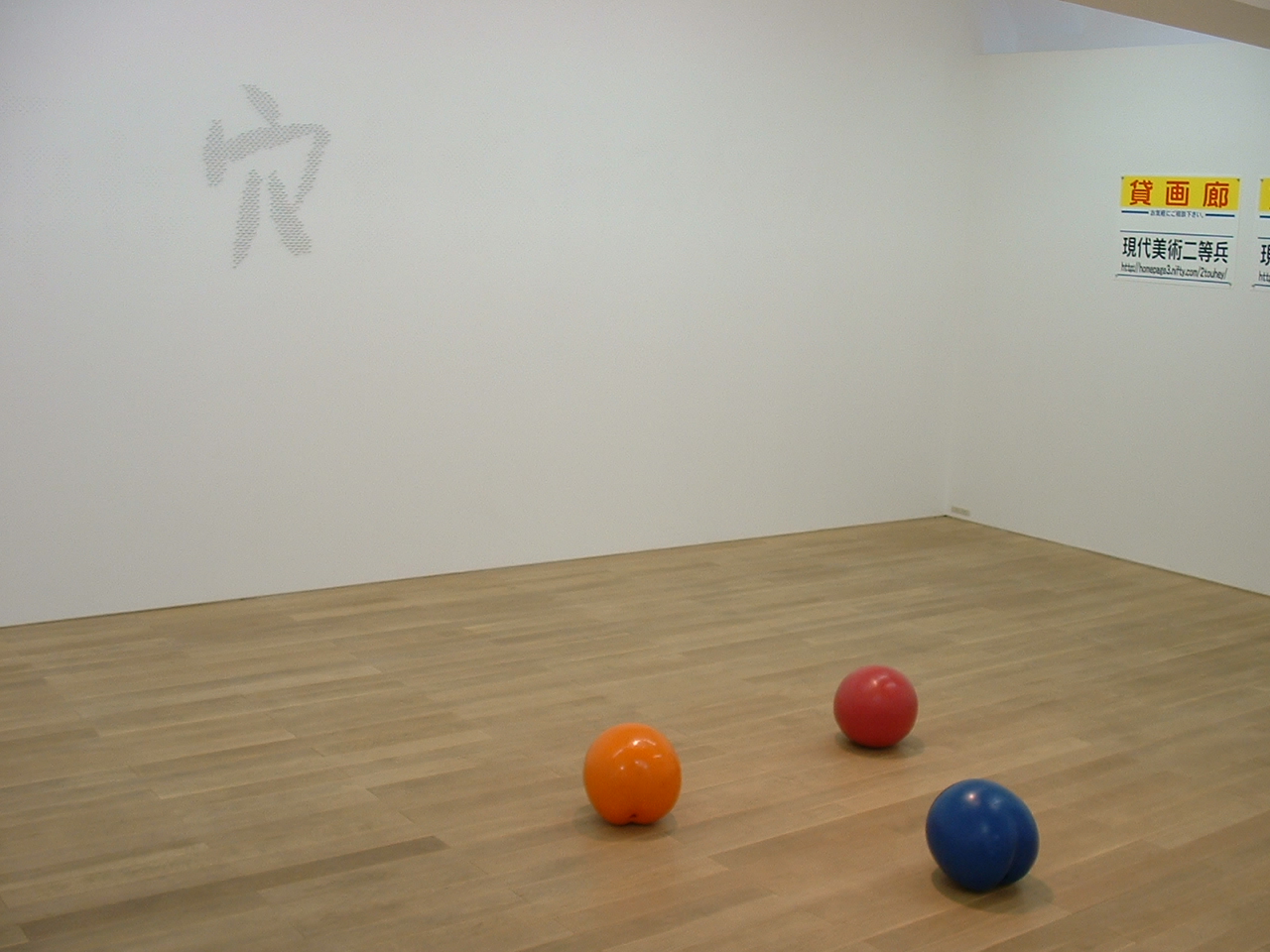 結局、その画廊での話はなくなり、今回そのアイデアをこの展覧会で発表してもらう事になったのだが、壁に書かれた(描かれた)「画廊に穴をあけるな!」という一見するとダイレクトなメッセ−ジは、実のところ誰に向けられてるのかは不明であり、まるで近所の錯乱したおっさんのはり紙のような「庶民の現実」感と、それをミニマルに釘穴でそろえ、ミニマルアートのようにもとれるが、「穴をあけるな」と穴を空けて書くという、なんとも複雑な矛盾をも内包した作品だといえるだろう。