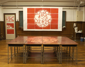 ![]() 実際小学生が使っていた中古品の学校机の天板部分を彫刻刀で彫って版とし、それを刷って版画にしました。机の数は16台。そして16枚の版画をつなげて一枚の作品にしました。インクは油性の木版画用を使い、まず「あか」を刷り、乾いてから「だいだいいろ」を刷ることにより、朱色を出してみました。