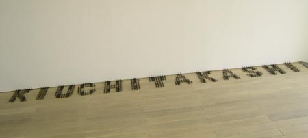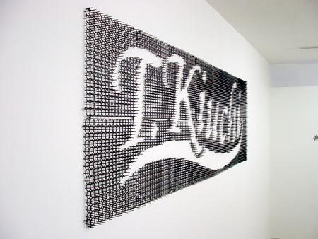 木内貴志作品集TOP > キウチトリエンナーレ2004・名前と美術 > 名刺 猫よけタイプ 名刺 猫よけタイプ2004年 プラスチック製猫よけマットを加工 760mm×2600mm×25mm(壁掛けタイプ) 一文字あたり約220mm×222mm×25mm![]() 皆さんは「名を刺す、ってどういうことやろね」って思った事はあるでしょうか?僕はあります。