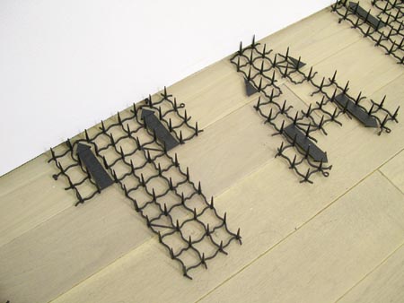 手裏剣とくれば、やはり同じ忍者物、ってことで「まきびし」による造形を作るべく試みたのですが、敢無く断念。で、バイトの郵便配達中に見つけた、庭によくある猫よけグッズに現代のまきびしを見た!ってことで代用品で試みてみました。 「床置き用」の方はホームセンターでよく売ってるタイプで、よくできてるんですが、その分加工しにくかったんで、「壁掛け用」には100円ショップ製のものを使いました。こちらの方が安価かつ見た目もすっきりしていて加工しやすかったです。 100円ショップでは一度に大量に購入したため、さぞかし猫嫌いなんだろうな〜と思われたと思います。 (2004年当時の「作家による有り難くも鬱陶しい作品解説」より)