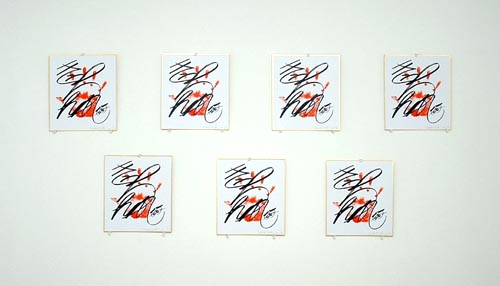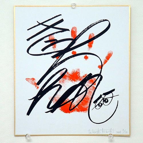 サインって同じ文字を書くんだから、別に印刷のほうが効率ええのに、直筆のほうが価値が高いですね。何なんでしょうかね、あの感じ。 そこで私がまるで有名人気取りのサインを色紙に施し、それをシルクスクリ−ンで版画として制作しました。サインの作品にサインもしました。関取よろしく手形も印刷しておきましたが、どうでしょう? (2004年当時の「作家による有り難くも鬱陶しい作品解説」より)