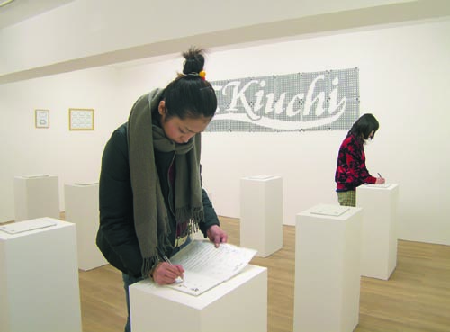 で、そんな時、あまり自分には面白いと感じない展覧会を多く見た日なんか、その日の印象が、「なんか今日はギャラリーで、名前を書いた1日やったなあ」となったりするような経験はないですか?僕はあります。 時には義理の為、わざわざ電車にのって出かけて、名前書いて帰ってくる、てな時もあります。何なんでしょうかね、あの感じ。 「なんでわざわざそんなことすんの?アホちゃう?」といわれれば、そうだと自分でも思いますし、最近はだいぶそういう事はしなくなりましたが、つい習性ですかね、ムキになって名前を書きに…てな感じで、作品を見に行ってるのか、名前を書きにいってるのか、目的がよくわからなかったりしてしまうことがあります。何なんでしょうかね、あの感じ。 それから、よく神社とかの中に、全国からの色んな神社の出張所みたいなのがあって、ここを一週したら…みたいなのや、プチ八十八カ所のオリエンテーリング、とか、この掛け軸を購入すれば、あなたも八十八カ所巡りをしたのと同じです…みたいなの。何なんでしょうかね、あの感じ。 そこで、今回はその感じを、そのまま作品化してみよう、というわけで、複数の画廊を巡り、その展覧会を鑑賞してその証として名前を書くというその制度のみを抽出し、名前のみを反復して書かされる、という無意味な行為を鑑賞と共に行なえる作品にしてみました。 ただ並べるのではない、という雰囲気を出す為、寺仏閣などの八十八カ所巡りの小さいシュミレーションのような、ありがたいかのような行為にも変換させ、ここで色んな有名ギャラリーを一度にまわった呈になれる、的なインチキ世界を形成してみました。 実在のギャラリーの名前を模した名前をひとつひとつに付けて、架空の信仰のようなものをでっちあげ、見た目はミニマルアートの様相を呈した、意味なし作品と意味なし行為のくり返しをしてもらおう、といった感じです。 実在の画廊を出張してもらう、というほどの行動力も実行力も備えてないもので、ここは得意の妄想に任せてみました。 タイトルも名曲「岫めぐり」みたいな情緒がでたら、と思ったんですが、どうでしょう? (2004年当時の「作家による有り難くも鬱陶しい作品解説」より)