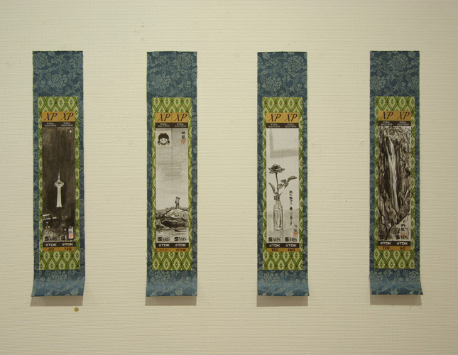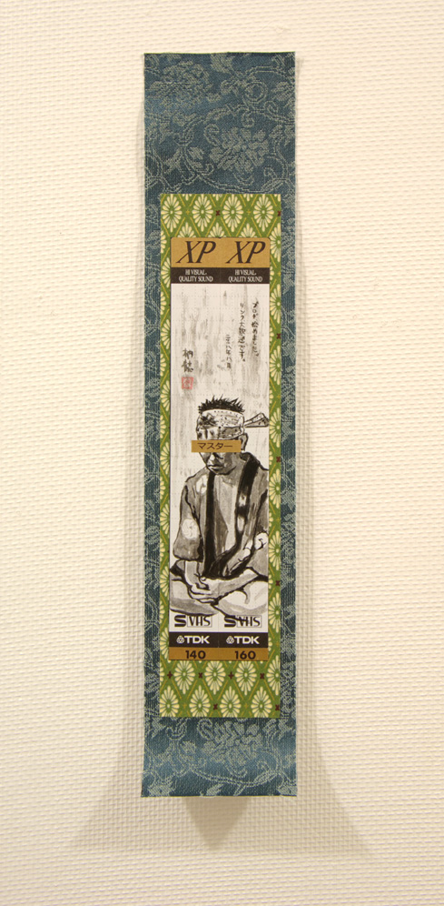 木内貴志作品集TOP > キウチビデオフェスティバル 〜VHSからDVD−Rへ〜 > VHS水墨 VHS水墨sumi-e on VHS label2008年 VHSラベルシール、墨汁、和紙、他 各270mm×55mm![]() VHSビデオテープの背ラベルのあまりを使って、水墨画を描きました。