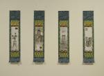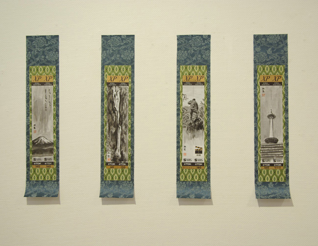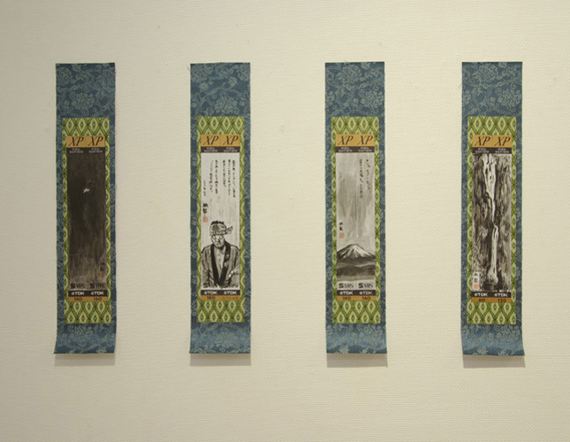 「ミニ掛け軸」的な雰囲気にしました。 モチーフには特に意味はなく、主に「ミクシイ日記」や自身のブログ等で使用した画像を元に描いています。