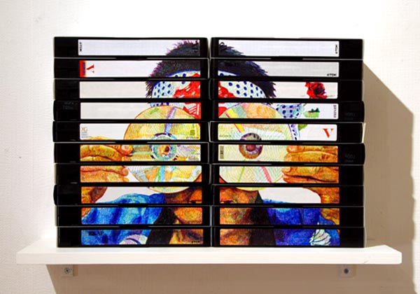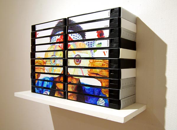 横向きに10本×2組重ねて、そこに法被男の自画像を描きました。 DVD−Rに自画像を描いた「VHSから」と言う作品と対になってます。 展覧会ではちょうど「VHSから」という作品と向き合う様に展示しました。 自身の映像記録メディアがVHSからDVD−Rに移行した様をそのまま作品化したもので、目の部分にDVD−Rを当てて、新メディアにエールを送っている、といった感じです。 「あとは頼んだぞ!DVD−R!」みたいな。