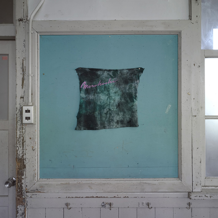 元はアイドルグループ「光GENJI」のTシャツで、偶然、実家に余っていた妹のいらない古着でした。 ふと見ると、そのメンバーの名前「morohoshi」という文字のピンク色部分だけが油性インクでも染まらず、深緑色に変色したTシャツの中でもくっきり浮んでまして、「なんかええ感じやな〜」ということで展示してみました。 ちょうど自身が異性に興味を持ち出した小学校高学年〜中学生の頃に、同世代の異性に特に人気の高かったアイドルTシャツを、まさか30過ぎてボロ布として使うとは・・・。 アイドルの過去の栄光を、染み付いて取れない何かに重ね合わせてみましたとさ。