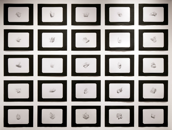 ある時、自慰行為後の鼻紙が、白い花に見えたことから、これを記録することにしました。 サブタイトルにあるように、不発弾であります。 栗の花のような匂い(臭い?)のする、男臭い花です。 気がつけば、鉛筆という炭の色の画材で白いものを描くという、デッサンで最もシンプルな方法で描いていました。 2009年の「放課後の展覧会」では、風俗店も多い繁華街が川を隔てて向こうにあるという閉校中の小学校の教室の窓側に、その繁華街に背を向けて咲いてるように展示しました。 また、同作を2011年の「愛の秘密工作室」にも出品。バレンタイン商戦で賑わう商業ビルの展覧会で展示しました。 (下の画像が2011年展示の様子です。)