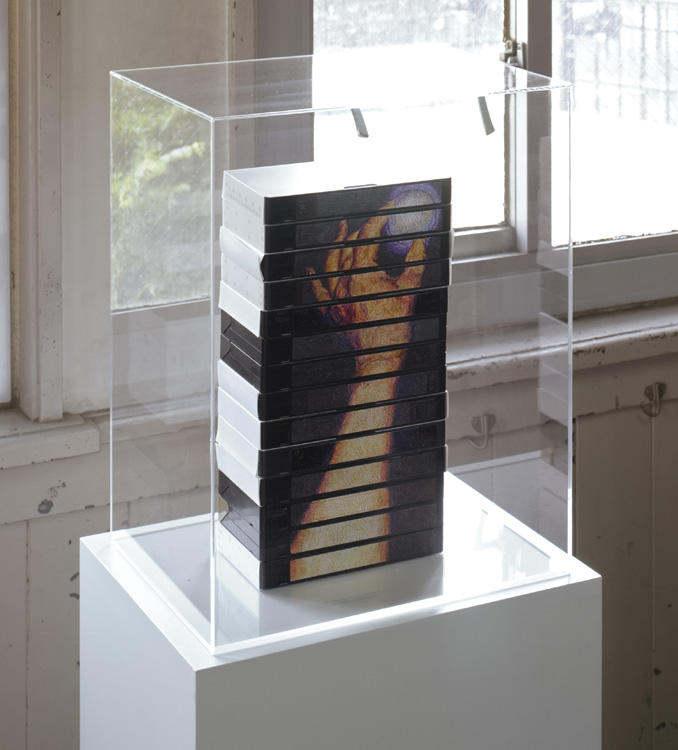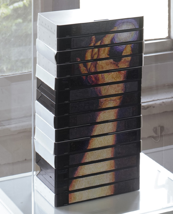 14本の自身の使用していたVHSビデオテープを使っています。 描かれているのは自身の左手で、何かしらを持ってるような、つかんでいるような、捉えようとしてるような、そんな感じに描いてみました。 使われてるVHSテープの中身は、全てアダルトビデオです。 市販のものと、友人が空き地で拾ってきたようなものと、自身がレンタルしてきてコピーしたもの等が含まれてます。 それらを古い順番に下から積み上げてます。 そこには無数の女優さんが出演されてるのですが、それが、自身の異性の好みのタイプの遍歴ということにもなります。 VHSからDVDへとメディアが移行し、これらはほとんど再生しなくなり眠っていたのですが、学校の教室での展覧会で、「一番学校に持って行ってはイケナイものを持ち込む」ということで作品化し、展示しました。 なので、厳重にアクリルケースに入れて展示しました。 昔、「学校の放送室で先生がアダルトビデオをあやまって全校に流してしまった」というような珍事件がありましたが、自身がその先生に同情したくなる歳になった、ということです。 ちなみに、絵を描く時等、基本は右利きですが、「夜は左利き」ということでもあります。
