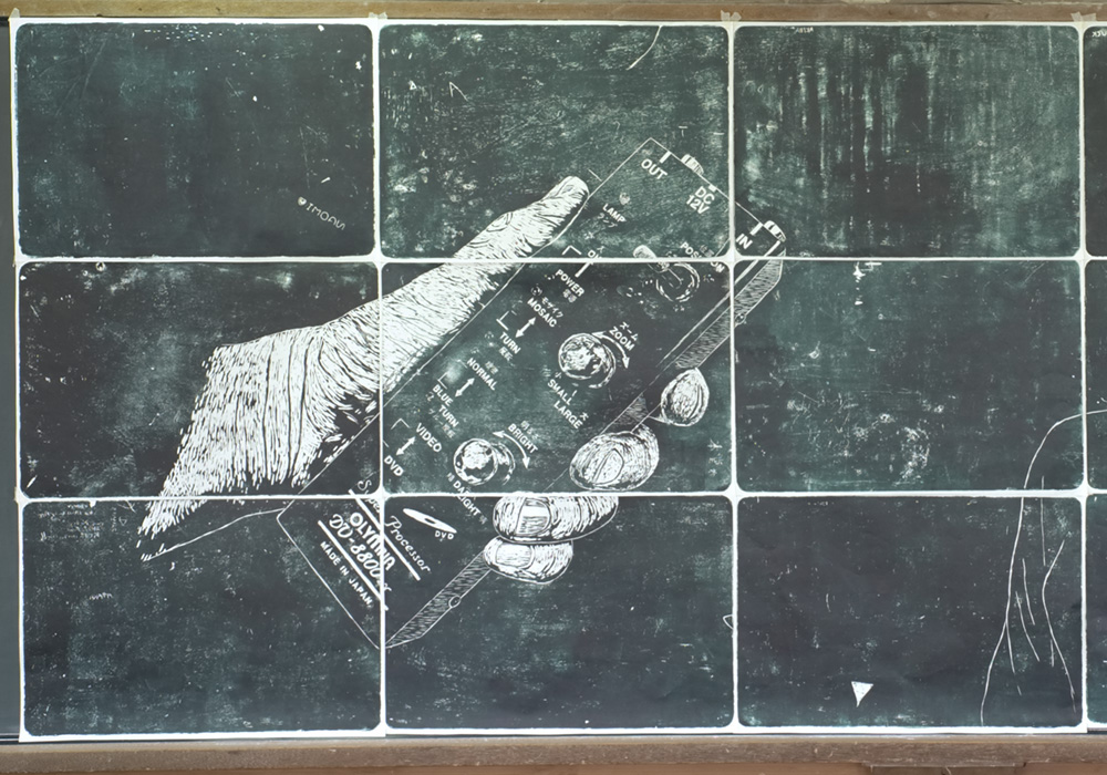 机15台を使用し、一枚の絵を刷りました。 モチーフとなってるのは「モザイク除去機を持つ手」と「顔を半分覆い隠した自画像」です。 どちらも、日本の青年男性向け雑誌によく登場する広告のイメージです。 前者はアダルトビデオのモザイクを消す、後者は包茎手術と、性に関する男性の興味と不安を煽るかのような広告イメージです。 今回はこの作品を、まだ自身にとって、そういうものが未知なる世界だけど最も興味の湧いていた「中学生」の頃をイメージして作りました。 タイトルの「モザイクとレジェンド」というのは、関西のUHF系列で放送しているエロTV番組のCMで流れていたラブホテルの名前です。 外国人男女が「モザイクゥ〜〜!」「レジェンドォ〜〜!」と叫び合って抱き合うそのCMの声が耳にこびりついて離れなかったので、タイトルにしました。 しかしまあ、この歳になってもまだそんな広告やCMを見てるとはね・・・。